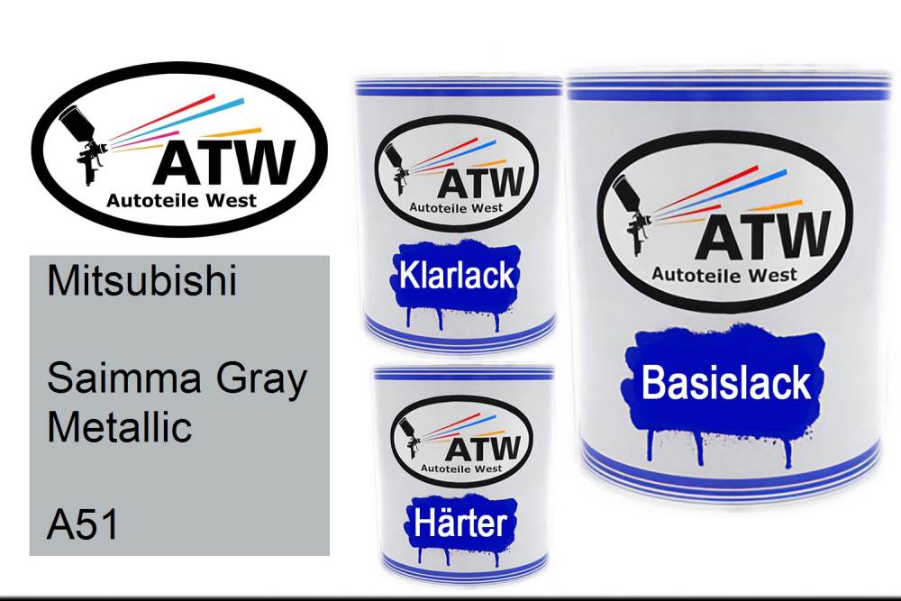 Basislack, 1L Lackdose + 1L Klarlack + 500ml Härter - Set. Für Mitsubishi, Saimma Gray Metallic, A51. Profiqualität von ATW.