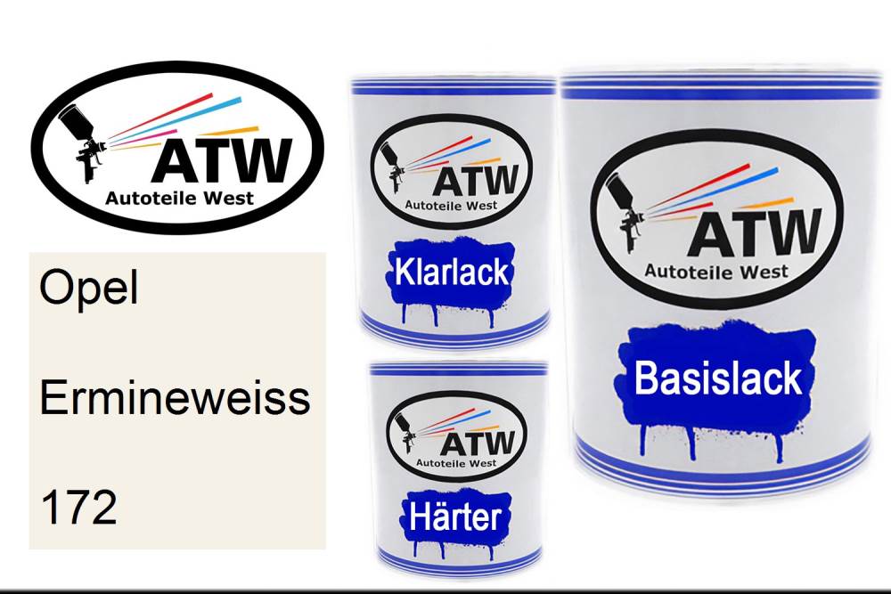 Basislack, 1L Lackdose + 1L Klarlack + 500ml Härter - Set. Für Opel, Ermineweiss, 172. Profiqualität von ATW.